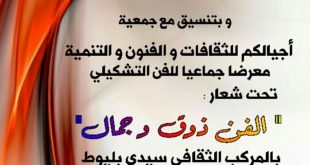 عبد المجيد رشيدي يحتضن المركب الثقافي سيدي بليوط بمدينة الدار البيضاء من 6 إلى 12 يناير 2020، معرضا للفن التشكيلي تحت شعار” الفن ذوق وجمال” ويشارك في هذا المعرض المنظم من طرف الفنان التشكيلي عبد اللطيف صبراني، بتنسيق مع جمعية أجيالكم للثقافات والفنون والتنمية، نخبة من أهم فناني الحركة التشكيلية …