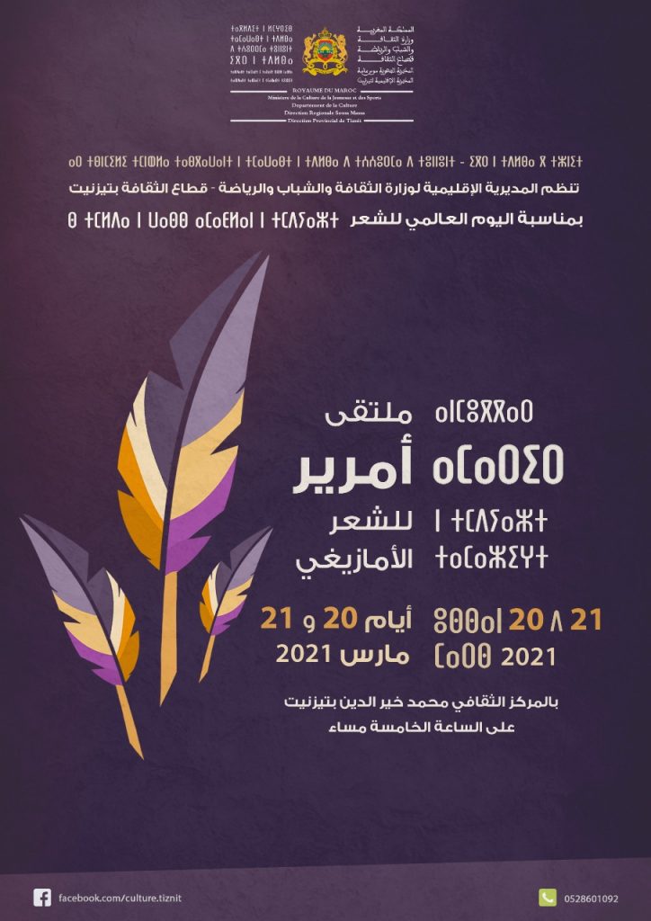 بمناسبة الاحتفال باليوم العالمي للشعر تحتضن مدينة تيزنيت فعاليات الدورة الأولى من ملتقى “أمرير” للشعر الأمازيغي، والمنظم من طرف المديرية الإقليمية لوزارة الثقافة والشباب والرياضة – قطاع الثقافة – هذا الحدث سيحتضنه فضاء المركز الثقافي محمد خير الدين خلال يومي 20 و21 مارس 2021 .