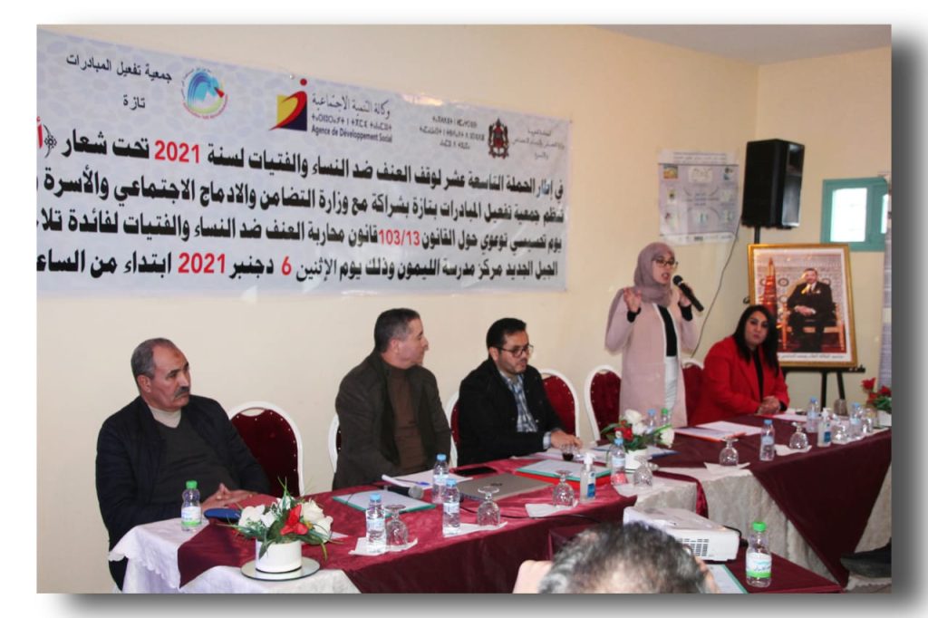 استمرارا في أنشطتها المتنوعة التي دأبت على تنظيمها، قامت جمعية تفعيل المبادرات بتازة بشراكة مع وزارة التضامن والإدماج الاجتماعي والأسرة إلى جانب وكالة التنمية الاجتماعية ووزارة التربية الوطنية بتنظيم يوم تحسيسي وتوعوي بتاريخ 06 دجنبر 2021 لفائدة تلميذات وتلاميذ مدرسة الفرصة الثانية الجيل الجديد- مركز مدرسة الليمون- تحت عنوان “قانون 13/103 قانون محاربة العنف ضد النساء والفتيات”، حيث اختير لهذا اليوم شعار “أنخرط” je m’engage الذي يأتي في إطار الحملة التاسعة عشر لمناهضة العنف ضد النساء والفتيات. في بداية أشغال هذا اليوم التحسيسي، رحبت رئيسة الجمعية المنظِّمة، ذة. أمال العزوزي، بالحضور وكذلك بالمشاركين، مشيرة إلى أهمية مثل هذه اللقاءات التحسيسية والحقوقية والقانونية، باعتبارها مناسبة لعرض وجهات نظر المشاركين وطروحاتهم وأفكارهم ومقترحاتهم، وإغناء المستفيدين والمستفيدات من هذا اليوم التحسيسي بالمعلومات القانونية والتربوية والحقوقية.