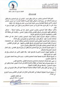 تحرك نقابة المحامين ياتي بعد تعميم دورية ثلاثية موقعة من وزارة العدل والنيابة العامة والمجلس الاعلى للسلطة القضائية ،يحث فيه رؤساء المحاكم بتفعيل قرار الحكومة باعتماد جواز التلقيح للولوج للمحاكم .