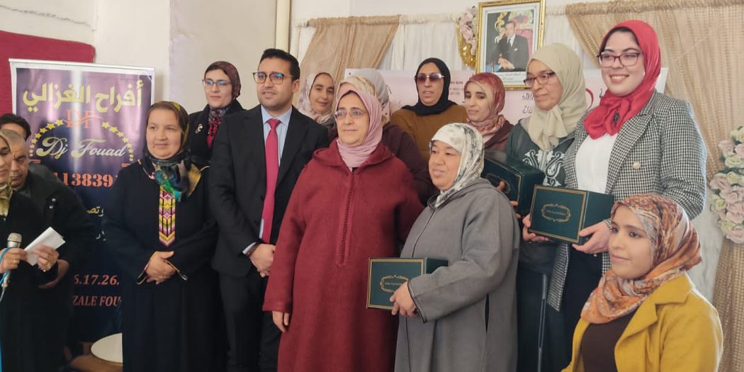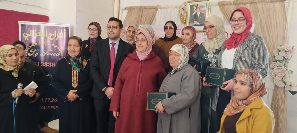 حيث تم توزيع بعض الهدايا والورود كرمز للتقدير والعرفان بعد كلمة السيد ياسين عفراني المندوب الإقليمي للتعاون الوطني تازة الذي نوه بالمجهودات المبذولة من طرف جميع المستخدمات كل من منصبها وحسب مهامها كما نوه بجمعية الخنساء النسائية للتنمية الاجتماعية على الدور الكبير الذي تقوم به لدعم وتاهيل المرأة عبر مختلف الشعب و المهن الحرفية وذلك بمساهمة وتدخل جميع الشركاء من مبادرة الوطنية للتنمية البشرية، مؤسسة التعاون الوطني ،حيث أكد من خلال كلماته على دور المرأة في شتى المجالات ولا سيما في المجال الحرفي والمهني، وذلك تماشيا مع برامج وزارة التضامن والادماج الاجتماعي والأسرة ومؤسسة التعاون الوطني في دعم المشاريع المدرة للدخل لفاءدة المرأة من اجل تحسين دخلها الاقتصادي.