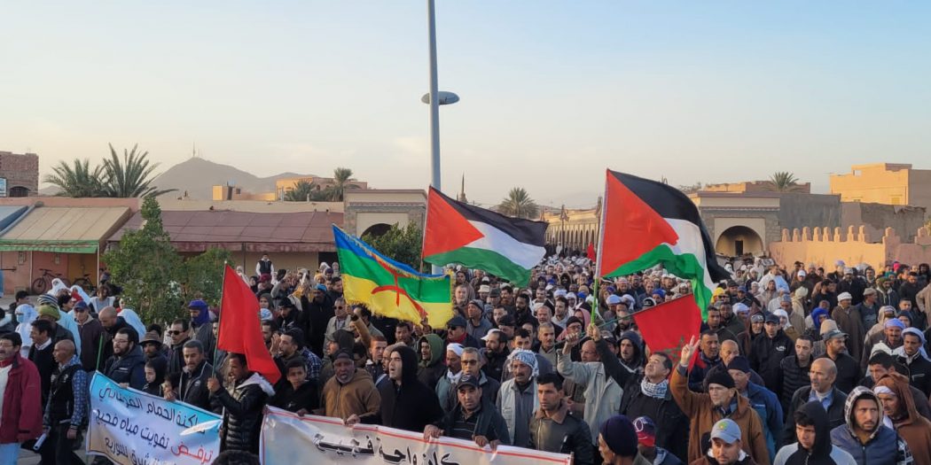 خرج سكان مدينة فجيج عشية يوم أول شهر دجنبر 2023 في ثاني اكبر مسيرة احتجاجية للتعبير عن رفضهم القاطع لتفويت قطاع مياه الشرب لما يسمى بشركة مجموعة الشرق للتوزيع الجهوية، ومما زاد حشود هذه المسيرة الإضراب العام، الذي دعت اليه التنسيقية المحلية للترافع على قضايا المدينة، هو الانخراط الوازن لكل التجار وأرباب المطاعم والمقاهي والصناع على مختلف مهنهم والصيدليات، كما انضم إليها أيضا أرباب شاحنات نقل الرمال بشكل تضامني. للتذكير، فإن مجلس جماعة فجيج كان قد سبق له أن صوت بالإجماع على رفض الانضمام لمجموعة الشرق للتوزيع، وهي شركة ستفوت لها جماعات الجهة، بموجب اتفاقية، أمر تدبير مرفق الماء، وكذا الصرف الصحي والكهرباء. وقد كان لقرار هذا الرفض الذي اتخذه المجلس يوم 26,أكتوبر 2023 صدى طيبا في نفوس المهتمين والمتابعين والساكنة عامة.