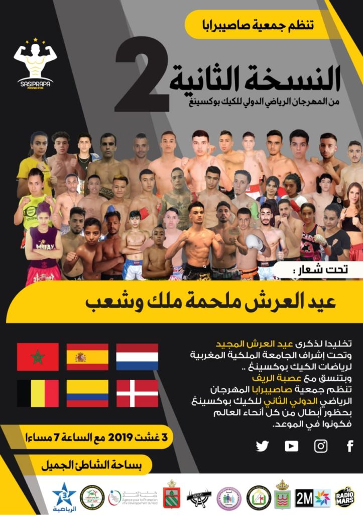 تخليدا للذكرى العشرين لتربع صاحب الجلالة الملك محمد السادس نصره الله وأيده على عرش اسلافه المنعمين وتحت إشراف الجامعة الملكية المغربية لرياضات الكيك بوكسينغالموايطاي الصفات و الرياضات المماثلة وبتنسيق مع عصبة الريف تنظم جمعية صاصيبرابا المهرجان الدولي الثاني للكيك بوكسينغ وذلك يوم السبت 3 غشت ابتداءا من الساعة السابعة مساءا بساحة الشاطئ الجميل بكالابونيطا بالحسيمة.