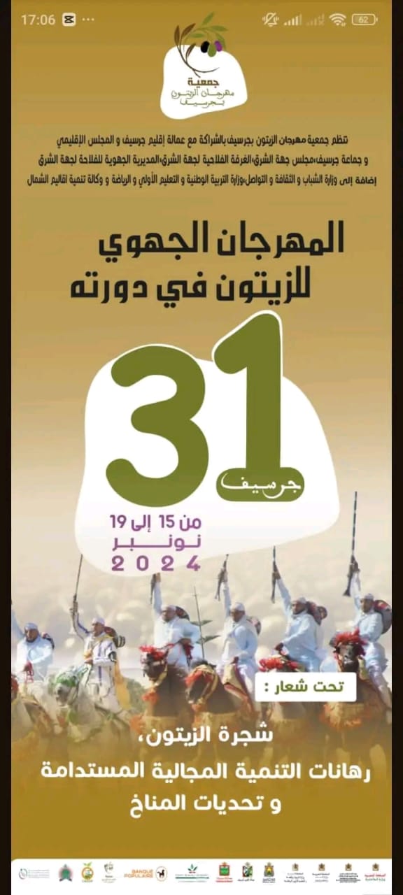 تستعد مدينة جرسيف، لاحتضان الدورة الـ 31 لمهرجان الزيتون، من 15 إلى 19 نونبر الجاري، التي ستقام بالموازاة مع الدورة الرابعة للمعرض الجهوي الفلاحي.