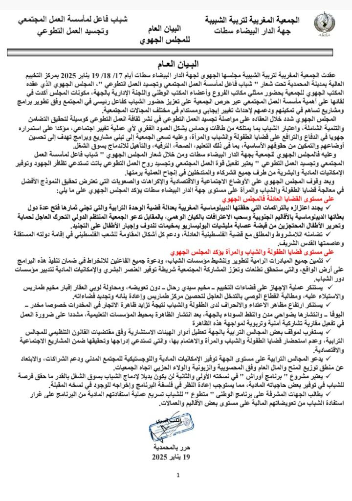 وبعد وقوف المجلس الجهوي على الأوضاع الاجتماعية والاقتصادية والإكراهات والصعوبات التي تعترض تحقيق النموذج الأفضل في معالجة قضايا الطفولة والشباب والمرأة على مستوى جهة الدار البيضاء سطات يؤكد المجلس الجهوي على ما يلي:
