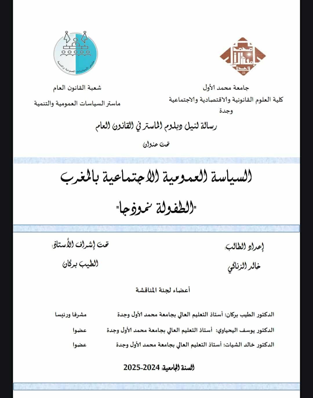 وكانت الرسالة بعنوان “السياسات العمومية الاجتماعية بالمغرب: الطفولة نموذجا”، تحت إشراف الدكتور الفاضل الطيب بركان.