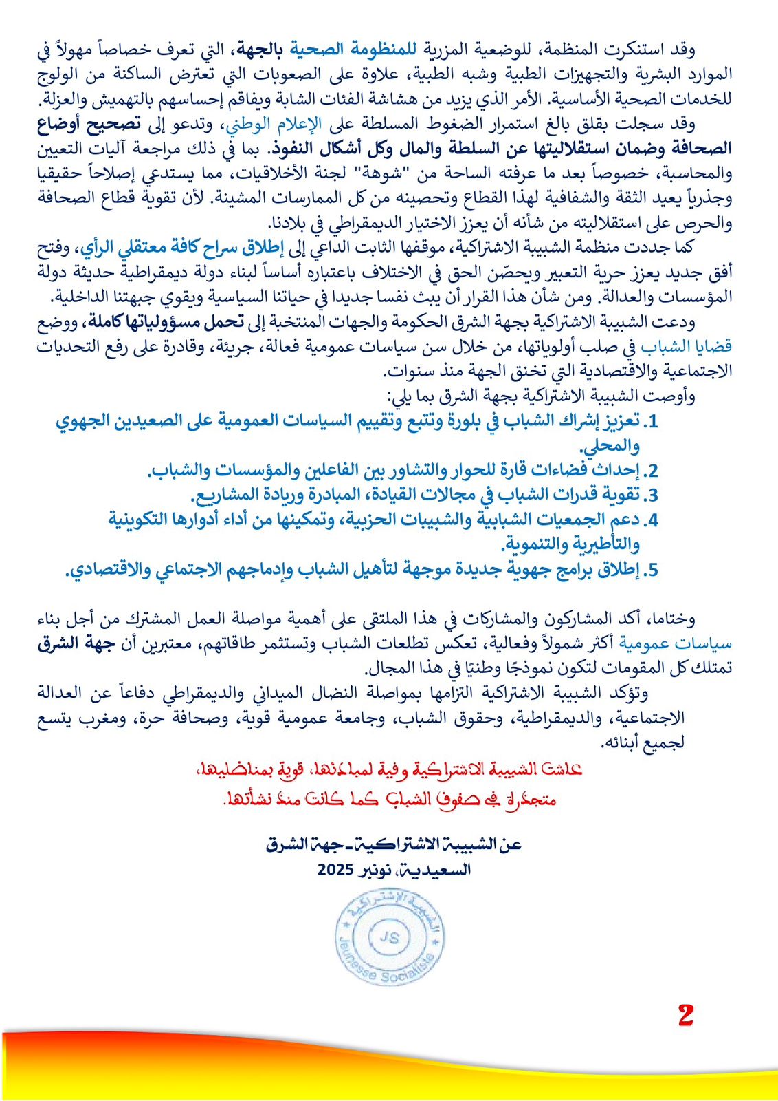 وجددت الشبيبة الاشتراكية موقفها الداعي إلى إطلاق سراح معتقلي الرأي وتعزيز حرية التعبير باعتبارها أساساً لبناء دولة ديمقراطية حديثة. كما دعت الحكومة والجهات المنتخبة إلى تحمل مسؤولياتها في وضع قضايا الشباب ضمن أولوياتها من خلال سياسات عمومية فعالة وقادرة على رفع التحديات الاقتصادية والاجتماعية التي تعرفها الجهة.