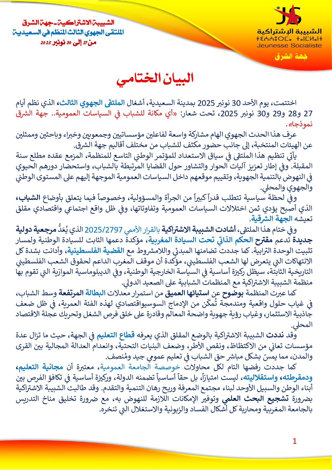 وفي ختام الأشغال، أشادت الشبيبة الاشتراكية بالقرار الأممي 2797/2025، معتبرة أنه يشكل مرجعية دولية جديدة داعمة لمقترح الحكم الذاتي تحت السيادة المغربية، مؤكدة في الوقت ذاته دعمها الثابت للوحدة الترابية.