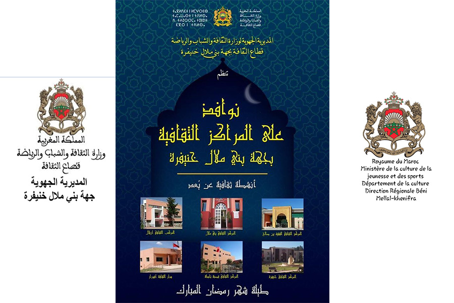 انسجاما مع الظرفية الخاصة بالحجر الصحي والاجراءات الاحترازية للوقاية من كوفيد 19 ، وفي إطار تنفيذ استراتيجية وزارة الثقافة والشباب والرياضة – قطاع الثقافة – في مجال التنشيط الثقافي و الفني والتراثي ، ومن أجل المساهمة في التصدي لمواجهة وباء كورونا – كوفيد 19 ، وبمناسبة شهر رمضان الأبرك ، وسعيا منها في تشجيع الإبداع الثقافي والارتقاء بكل أشكاله التعبيرية ، ولضمان استمرار التواصل مع الفنانين والمبدعين والفرق الفنية ومنخرطي ورواد المؤسسات الثقافية و الفنية التابعة لوزارة الثقافة بجهة بني ملال خنيفرة – قطاع الثقافة – ، سطرت المديرية الجهوية لقطاع الثقافة بجهة بني ملال . خنيفرة ( قطاع الثقافة ) برنامجا تفاعليا عن بعد طيلة شهر ماي الحالي ، تحت شعار ” نوافذ على المراكز الثقافية” ، وذلك بتنسيق وتعاون مع مختلف المؤسسات الثقافية التابعة للمديرية بالجهة (دور الثقافة بكل من بني ملال وأزيلال ، والفقيه بن صالح ، وخنيفرة ، وأفورار ، وقصبة تادلة ، وأبي الجعد ) .