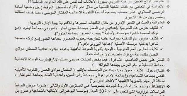 - الانفرادية في التعاطي مع ملفات الشغيلة التعلمية من خلال عدم الإلتزام بالمحاضر-وضعية اساتذة الراضي السلاوي نموذجا- مما أنتج متضررين ووضع محتقن بالثانوية الاعدادية المختار السوسي.